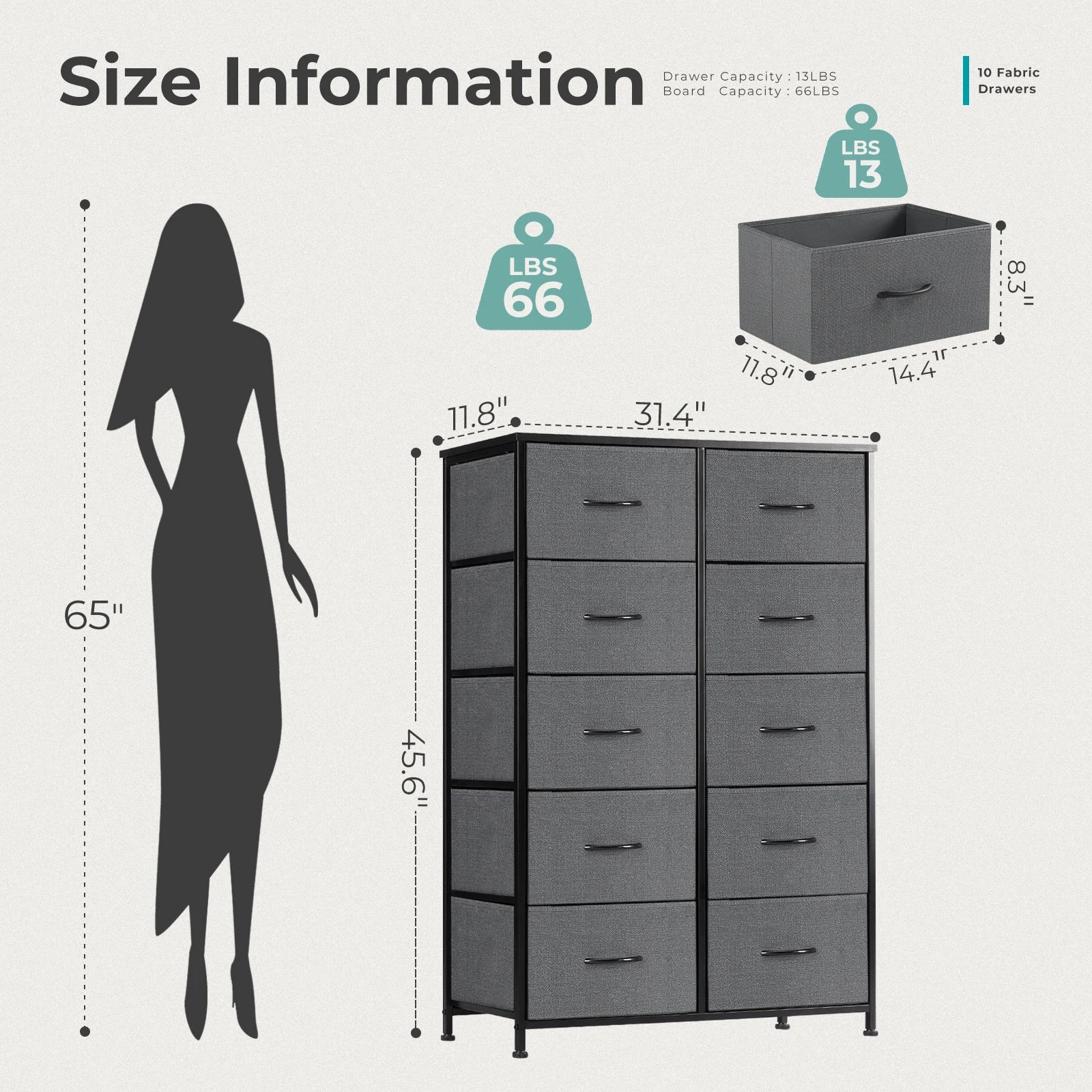JHK 10 Fabric Drawers Nightstand Storage Cabinet With Steel Frame Clothes Storage
