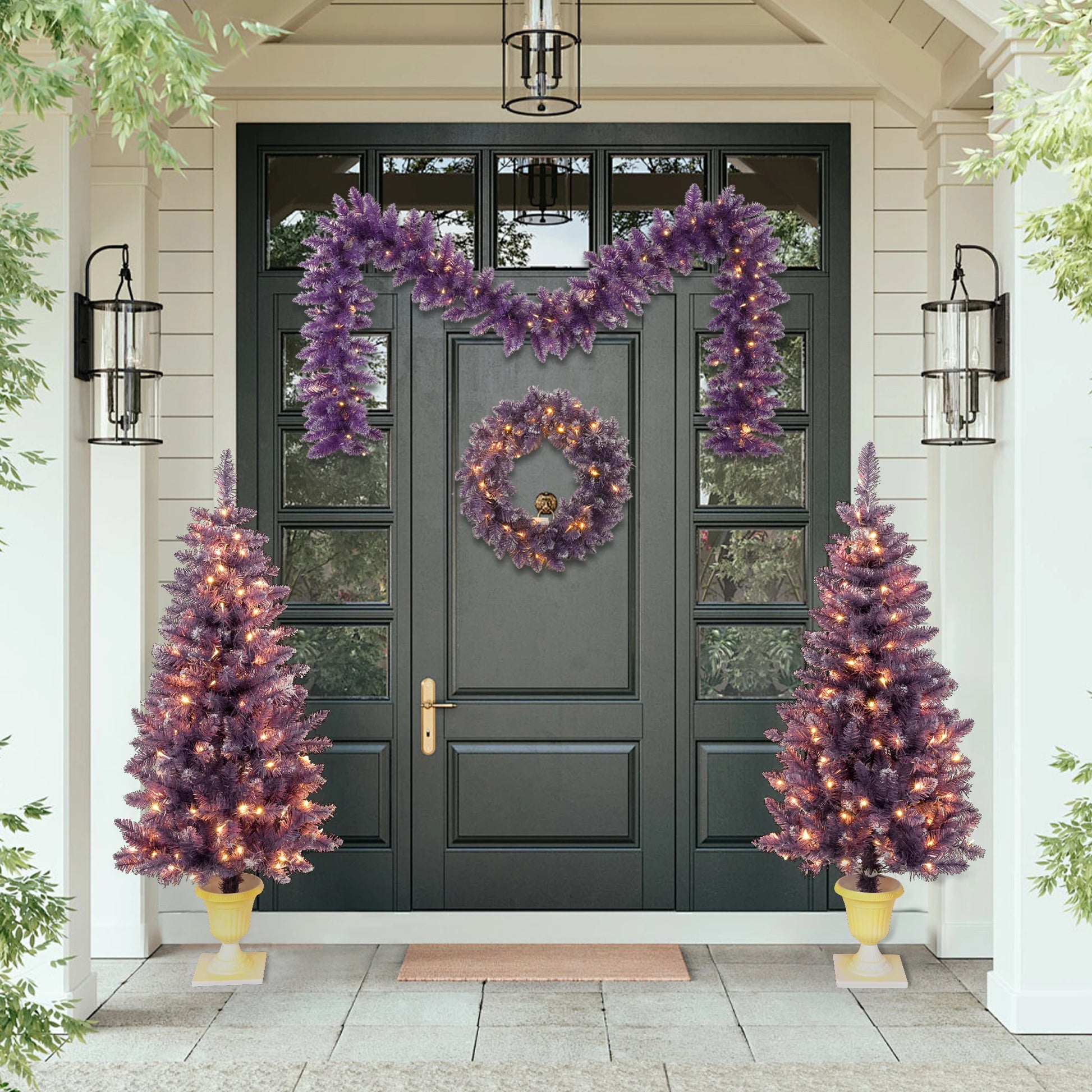 Pre-lit Christmas 4-Piece Set: Garland, Wreath, 2 Entrance Trees with LED Lights, Purple PVC. Ideal Festival Celebration Set.