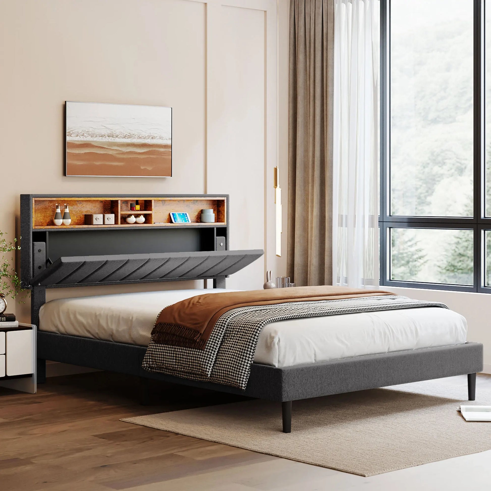 Queen Size Upholstered Platform Bed with Storage Headboard and USB Port, Linen Fabric Upholstered Bed