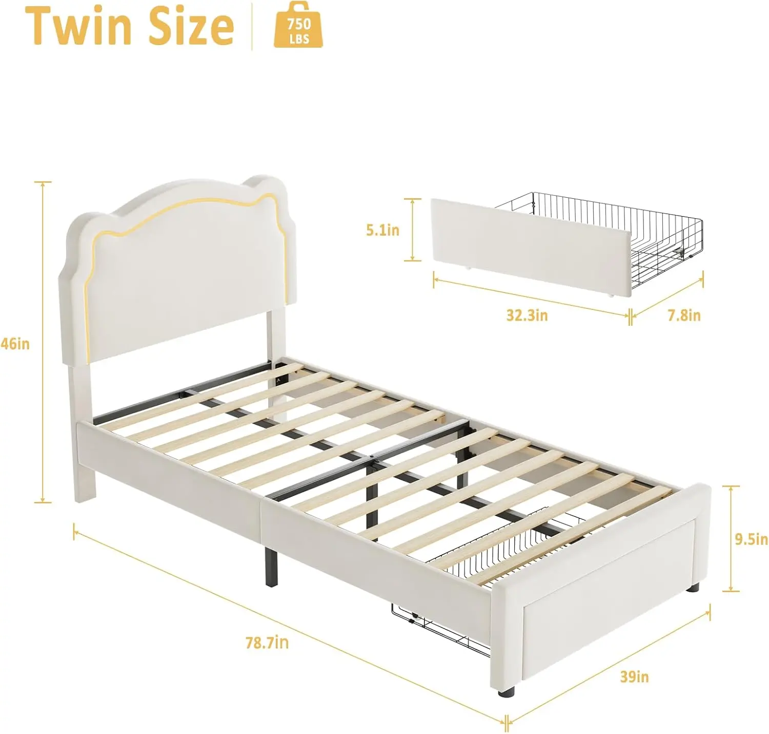 Twin Bed Frame with Upholstered Adjustable Headboard & Smart LED Velvet Princess Platform Bed for Girls/Kids Wood Slats Support