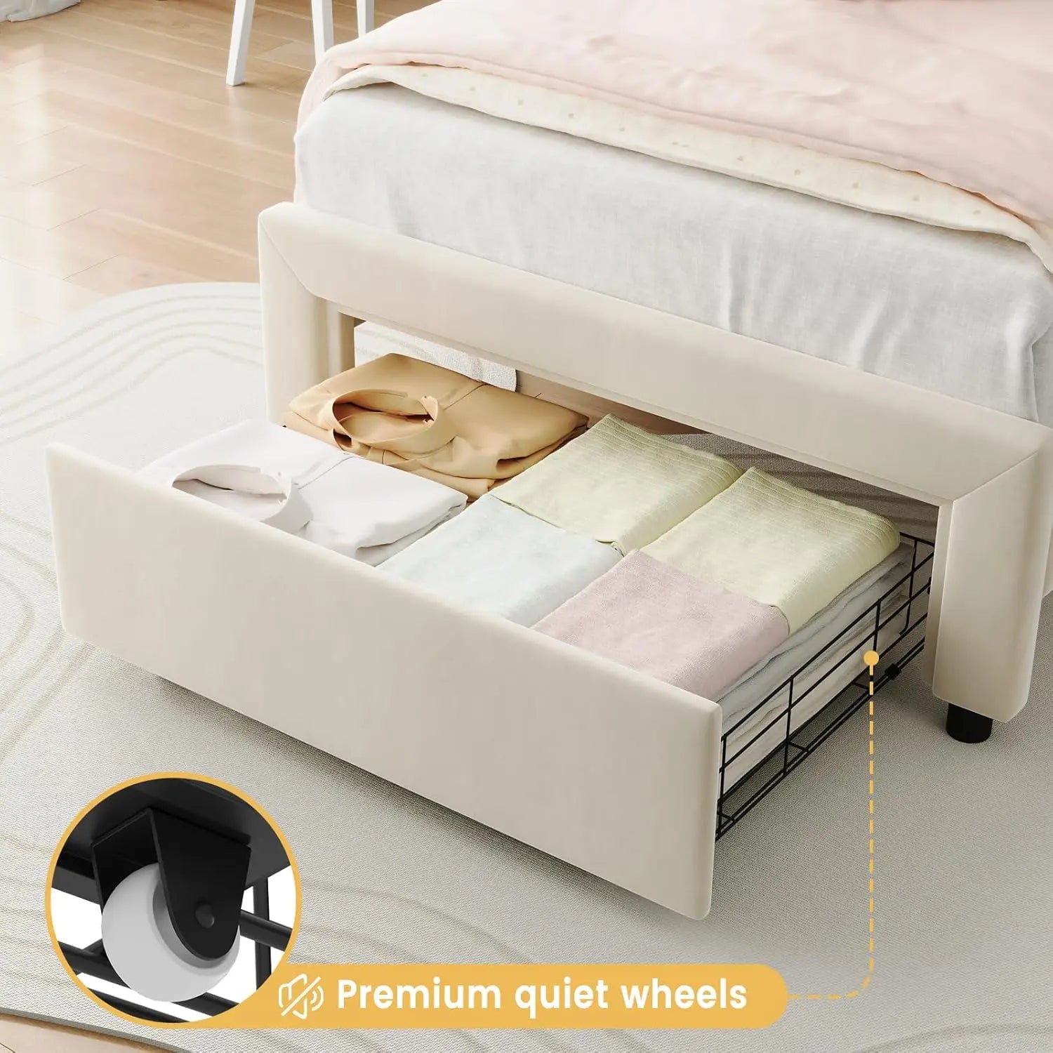 Multi-Function RGB LED Bed: This upholstered bed frame features smart LED light strips that offer over 16 million colors and 20+ lighting effects (like brightness, flash, and wave), plus multiple modes (music, mic, timer, etc.) for creating your ideal bedroom. In music mode, the LED lights flash with your music, providing an immersive experience right at home.